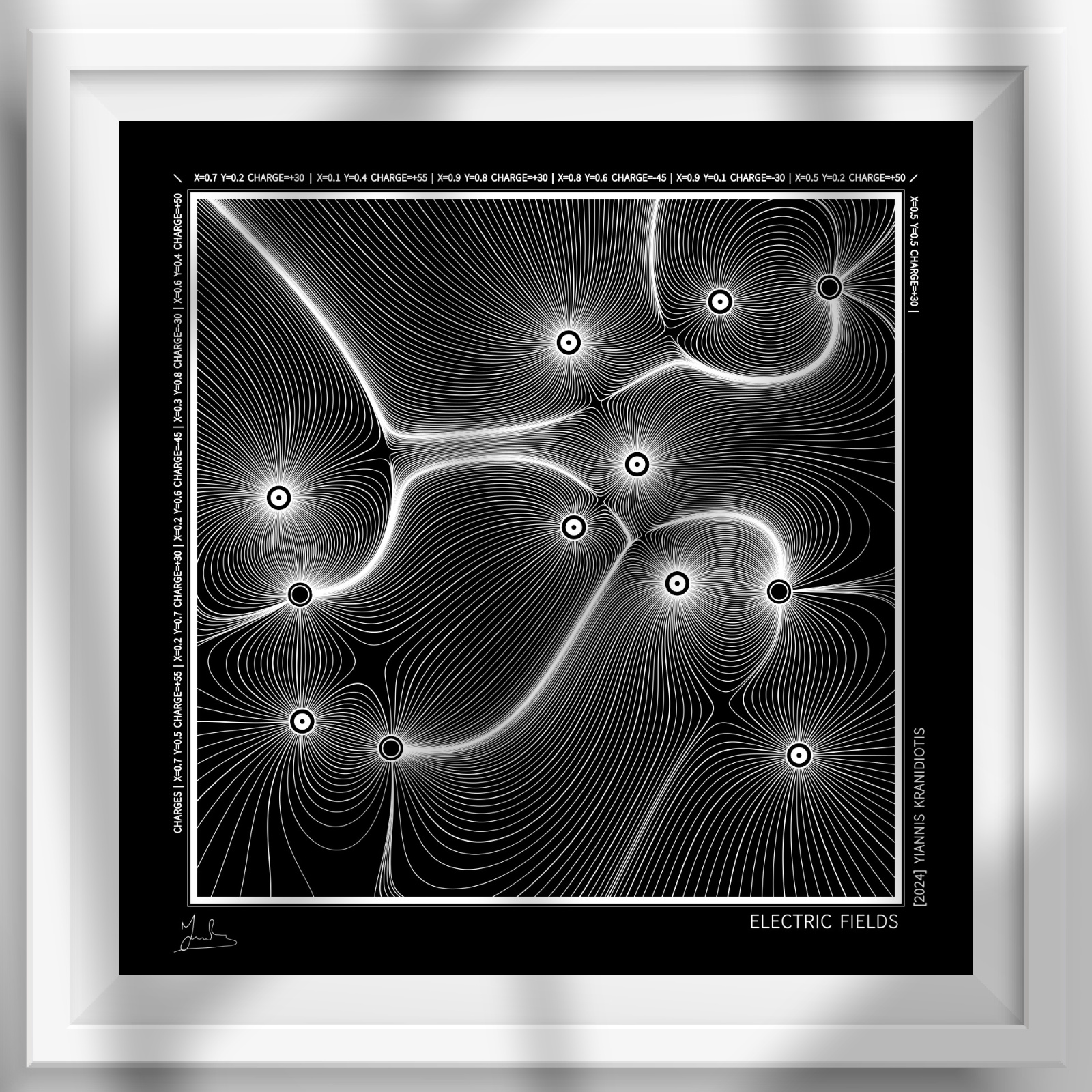 “Electric Fields” is inspired by the fields created from electrically charged particles in space. Lines are formed following the paths of positively charged particles. The density of lines at a specific location in space reveals information about the strength of the field at that location. Every single location in space has its own electric field strength and direction associated with it. Consequently, the lines representing the field cannot cross each other at any given point.